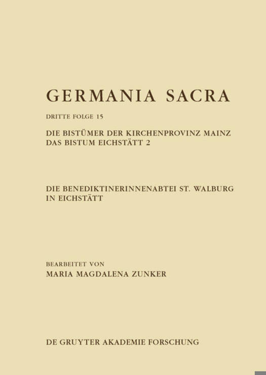 Die Benediktinerinnenabtei St. Walburg wurde im Jahre 1035 durch Graf Leodegar von Graisbach-Lechsgemünd am Grab der hl. Walburga in Eichstätt gegründet. Der Walburgakult nahm durch alle Jahrhunderte stets eine zentrale Stellung im Leben der Benediktinerinnen dieses Klosters ein, dessen Bedeutung insbesondere in seiner Eigenschaft als vielbesuchte Wallfahrtstätte begründet ist. In der Mitte des 15. Jahrhunderts wurde die Abtei durch den Eichstätter Bischof Johann von Eych reformiert. Nach der Erholung von den im Dreißigjährigen Krieg erlittenen Schäden folgte im 18. Jahrhundert eine wirtschaftliche und kulturelle Blütezeit. Dem Umstand, dass die Nonnen sich nach der Säkularisierung 1806 nicht vertreiben ließen und 1835 die Wiedererrichtung durch König Ludwig I. von Bayern erlebten, ist zu es verdanken, dass ein Großteil der Archivalien und der Kunstschätze im Kloster erhalten blieb. Dem Schema der Germania Sacra folgend wird ein Großteil der Quellen zur Geschichte des Klosters ausgewertet. Das Werk enthält einen ausführlichen Besitzkatalog sowie umfangreiche Listen der Angehörigen des Klosters.
