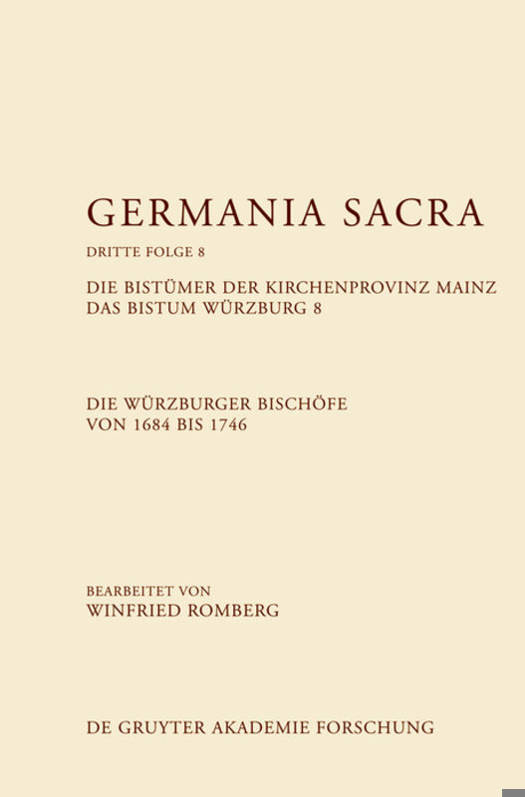 Im fünften Band der Würzburger Bischofsreihe der Germania Sacra behandelt Winfried Romberg die Episkopate der Epoche vom Spätkonfessionalismus katholischer Provenienz bis zum Einsetzen erster Impulse der Aufklärung. Neben der ständigen Herausforderung in der Reichs- und äußeren Politik war das Zeitalter geprägt vom verstärkten ordnungspolitischen Aufbau der weltlichen und geistlichen Landesverwaltung wie in religiös-ästhetischer Hinsicht vom Kirchenbarock und seinen Frömmigkeitsformen. Die vorgestellten fünf Pontifikate illustrieren den in diesem Zeitraum erreichten Höhepunkt absolutistischer Machtentfaltung einschließlich verwandter merkantilistischer Prinzipien. Die beiden Pontifikate der Schönborn-Brüder Johann Philipp Franz und Friedrich Carl markieren hierbei den Zenit dieses einflussreichen rheinisch-fränkischen Adelsgeschlechts im Hochstift Würzburg. Insgesamt fand das Würzburger Staatswesen in dieser Periode zu festen Formen, die auch im weiteren 18. Jahrhundert erhalten bleiben sollten.