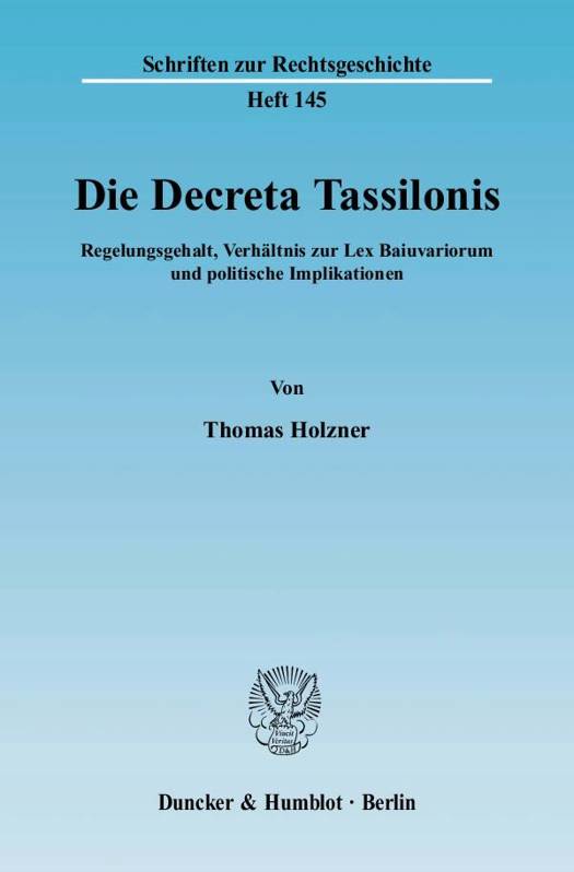 Als Decreta Tassilonis werden bislang die bairischen Synoden des 8. Jhs. in Aschheim, Dingolfing und Neuching bezeichnet, die 45 Kanones kirchlichen und weltlichen Inhalts umfassen, denen jedoch bislang keine besondere Aufmerksamkeit in der Forschung zu Teil wurde. Diese Lücke will Thomas Holzner mit der vorliegenden Arbeit schließen. Unter besonderer Berücksichtigung der Gesetzestechnik untersucht er deren Regelungsgehalt, Wechselwirkungen mit dem bairischen Stammesrecht, der Lex Baiuvariorum, sowie deren politische Implikationen.
