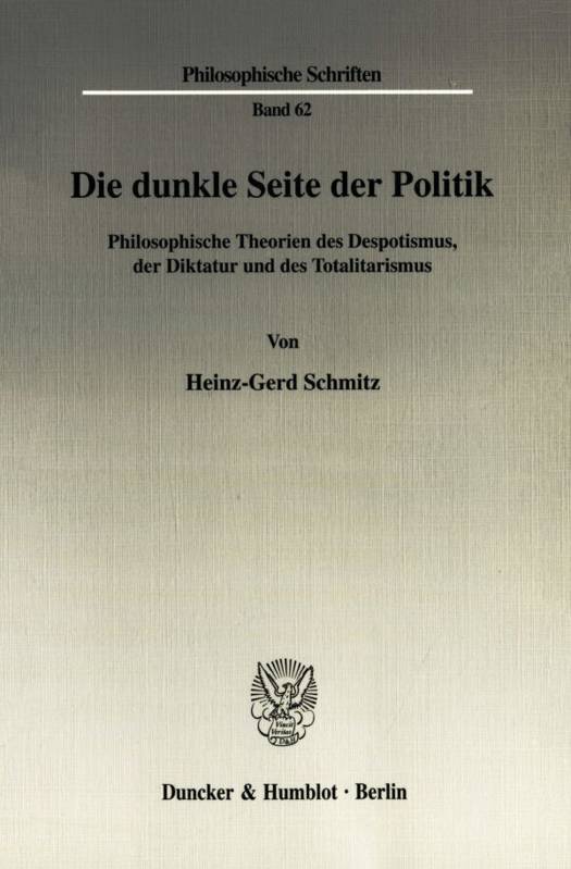 Heinz-Gerd Schmitz untersucht in den historischen Abschnitten seines Buches die Kennzeichnung des Despotismus in der Antike (Platon, Aristoteles), der Neuzeit (Locke, Montesquieu, Kant) und schließlich der Moderne im weitesten Sinne (Marx/Engels, Lenin, Hannah Arendt). In fünf eingeschobenen Überlegungen wird das Resultat des historischen Stationenganges systematisiert, so daß sich unterschiedliche Formen von Gewaltherrschaft herauskristallisieren: Despotismus und Paternalismus, Tyrannis und Diktatur. Letztere wird noch einmal differenziert, wodurch sich die Konzeptionen einer edukativen Wohlfahrts- und einer edukativ-ethischen Diktatur ergeben. Beide münden in den Totalitarismus. Der in den systematischen Kapiteln gewonnene Begriffsapparat dient dann dazu, Politie und A-Politie zu differenzieren und auf dieser Grundlage die Basis eines Begriffs des Poltischen ex negativo zu bestimmen. Überlegungen zum Toleranzpostulat runden die Arbeit ab.