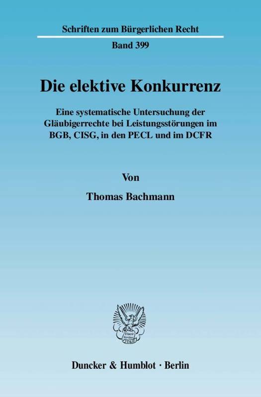 Thomas Bachmann stellt in seiner Dissertation diese elektive Konkurrenz als eigenständige rechtliche Kategorie in einem logischen System dar. Sie hat demnach bestimmte Merkmale, die eine Definition und die Abgrenzung zu verwandten Fällen einer Gläubigerwahl (Wahlschuld und Ersetzungsbefugnis) ermöglichen. Die Untersuchung beleuchtet und bewertet dazu umfassend die zum Teil problematischen Beziehungen zwischen den Leistungsstörungsrechten des BGB und zieht einen internationalen Vergleich zu den Modellen des CISG, der PECL und des DCFR.