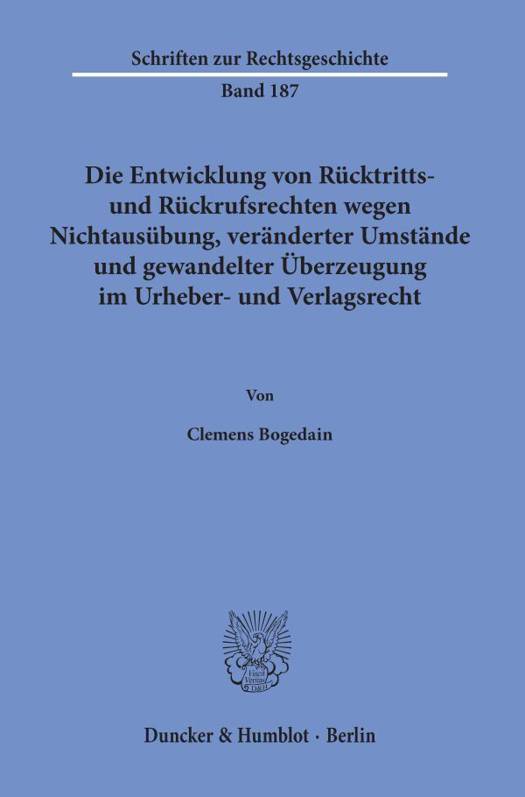 Die Entscheidung uber das Ob und Wie der Veroffentlichung eines Werkes ist eine Kernbefugnis des Urheberrechts. Mit ihr gehen nicht nur Hoffnungen des Urhebers auf Anerkennung und Gewinn einher, sondern auch Risiken, welche sich daraus ergeben, dass er mit der Veroffentlichung einen Teil seiner Personlichkeit offenbart. Das Urheberrecht tragt dem durch Ruckrufsrechte Rechnung, welche es dem Urheber gestatten, ein Nutzungsrecht wieder an sich zu ziehen, wenn der Verwerter die Publikation nicht oder nur unzureichend ausfuhrt oder sich die Uberzeugung des Urhebers bezuglich seines Werkes gewandelt hat. Ahnliche Befugnisse finden sich im Verlagsrecht, wobei hier auf veranderte Umstande abgestellt wird. Clemens Bogedain zeichnet die Entwicklung derartiger Instrumente von der Fruhen Neuzeit bis ins 21. Jahrhundert nach und zeigt Kontinuitaten sowie Bruche auf, wobei mannigfaltige Beruhrungen mit der Industriegeschichte und der Ideengeschichte des Geistigen Eigentums zutage treten.