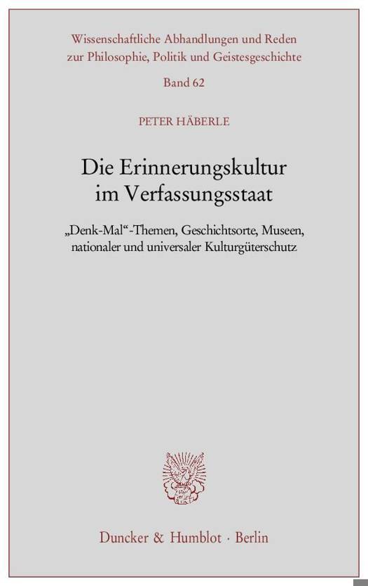 Mit dieser Studie vollendet sich eine Reihe von Monographien zu einer - sit venia verbo - »Tetralogie«. Auf dem Hintergrund der 1982 geschriebenen »Verfassungslehre als Kulturwissenschaft« (2. Aufl. 1998) galt die erste Konkretisierung dem Thema »Feiertage als kulturelle Identitätselemente des Verfassungsstaates« (1987); es folgten 2006 die »Nationalhymnen« und 2007 die »Nationalflaggen«. Zur Grundierung der offenen Gesellschaft der Verfassunggeber und Verfassungsinterpreten fehlte es noch an einer Erforschung des vierten Themenfeldes von »Denkmälern«, anderen Erinnerungen (hierzu gehören, neben Ehrenpreisen wie der Goethe-Medaille der Büchner- und Börne-Preis, Gedenkmünzen, aber auch zeitgenössische (z.B. F. Liszt), später wiedergefundene Münzen wie der Augustalis Friedrichs II., sonstige Themen des kulturellen Gedächtnisses eines Volkes, auch wenn speziell der Kulturgüterschutz schon 1996 aus der Sicht des Verf. erarbeitet worden ist (in: F. Fechner u.a. (Hrsg.), Prinzipien des Kulturgüterschutzes, S. 91 ff.)). Gerade in den Zeiten der vor allem ökonomisch sich vorantreibenden Globalisierung bedarf es einer auch wissenschaftlichen Vergegenwärtigung des kulturellen Wurzelgeflechtes bzw. kulturellen Humus', die den Typus Verfassungsstaat »im Innersten« zusammenhalten.