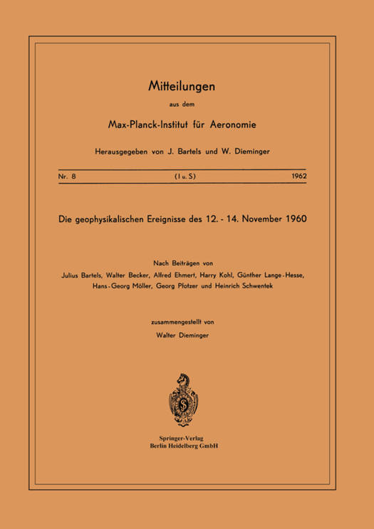In der Zeit vom 12. bis 14. November 1960 wurde ein erdmagnetischer Sturm beobachtet, der zu den stärksten bisher beobachteten gehört. Während dieses Sturmes wurden im Geophysikalischen Institut der Universität Göttingen und im Max-Planck-Institut für Aeronomie, Lindau/Harz, eine Reihe von bemerkenswerten Erscheinungen beobachtet, über die im folgenden berichtet werden soll. Um die Zusammenhänge besser überblicken zu können, werden außerdem einige Beobachtungen anderer Stellen mit herangezogen. Im einzelnen wird berichtet über: Solare Erscheinungen (Beobachtungen anderer Sonnenobservatorien) Erdmagnetisches Feld (Geophysikalisches Institut Göttingen) Senkrechtlotungen der Ionosphäre (Institut für Ionosphären-Fhysik) Absorption der Ionosphäre (Institut für Ionosphären-Physik) Funkausbreitung (Institut für Ionosphären-Physik) Sichtbares Nordlicht (Deutscher Wetterdienst, Amateurbeobac tungen an Land und an Bord deutscher Schiffe) Nordlichtreflexionen auf rn-Wellen (Amateurbeobachtungen) Kosmische Strahlung (Institut für Stratosphären-Physik) Sämtliche Zeitangaben dieses Berichtes sind in Weltzeit (U. T. ) gemacht. - 6 - 2. Solare Erscheinungen Die Ereignisse des November 1960 stehen zweifellos mit einem aktiven Gebiet in Zusammen- hang, das in der Zeit vom 6. bis 18. November über die Sonnenscheibe wanderte. Der große zu 0 diesem Gebiet gehörige Sonnenfleck bewegte sich in etwa 25 N heliographischer Breite und passier- tein der Nacht vom 11. auf 12. November den Zentralmeridian der Sonne. In seiner Umgebung flammten eine ungewöhnlich große Zahl von Eruptionen auf, die sich teilweise durch sehr hohe Inten- sität und lange Dauer auszeichneten.