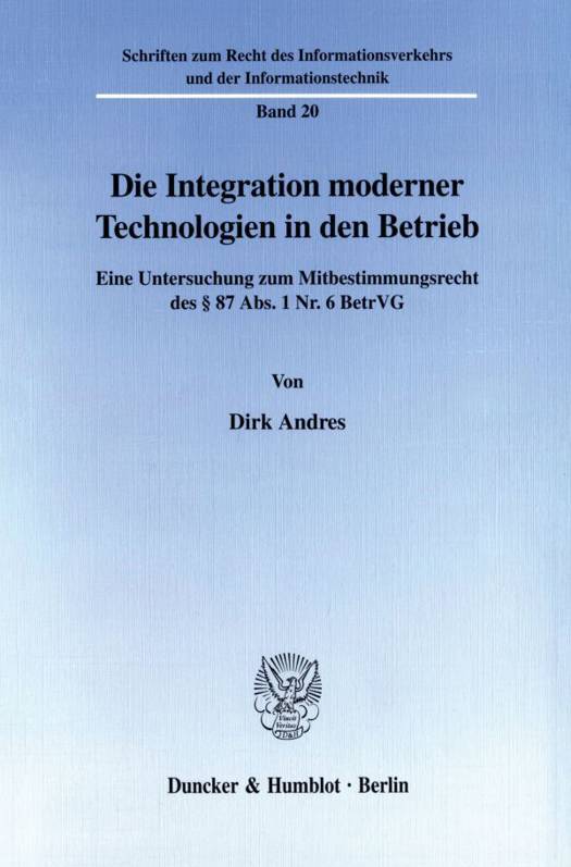 Der Autor befaßt sich mit aktuellen Fragen der Integration moderner Technologien in den Betrieb. Hierbei steht die Vorschrift des 87 Abs. 1 Nr. 6 BetrVG im Mittelpunkt. Dirk Andres setzt sich mit den Tatbestandsmerkmalen der Vorschrift und ihrer Auslegung in Rechtsprechung und Literatur auseinander. Diese Vorschrift zeigt die Schranken auf, die im Rahmen der Ausübung des Mitbestimmungsrechts bestehen, und klärt, in welcher Art und Weise das Mitbestimmungsrecht ausgeübt werden kann. Hierbei wird u. a. auf die Frage der Zuständigkeitsverteilung zwischen Einzel-, Gesamt- und Konzernbetriebsrat sowie die Hinzuziehung eines Sachverständigen eingegangen. Ein eigenes Kapitel beschäftigt sich mit der Umsetzung der gefundenen Ergebnisse auf aktuelle technische Einrichtungen. Dabei werden exemplarisch typische Formen moderner Überwachungstechnologien aufgegriffen, wie z. B. ISDN-Telefonanlagen, Computernetzwerke, Standard-Büro-Anwendungen, spezielle Überwachungssoftware, E-Mail und Internet.