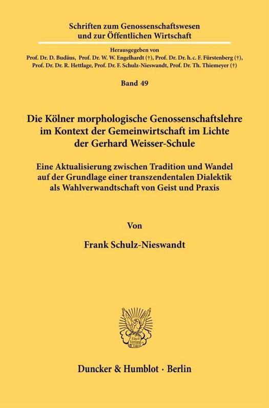 English summary: The Cologne Morphological Theory of Cooperatives in the Context of the Common Economy in the Light of the Gerhard Weisser School. An Actualization between Tradition and Change on the Basis of a Transcendental Dialectic as an Elective Affinity of Spirit and Practice The Seminar for Cooperative Studies in the WiSO Faculty of the University of Cologne is approaching its 100th birthday. How can the research-oriented doctrine of the seminar be characterized in its current status? The complex answer between critical Neo-Kantianism and Critical Theory is outlined epistemologically. It is about morphological research on the intersection of public economy, common good, commons, services of general interest, social space, civil society. German description: Das Seminar fur Genossenschaftswesen in der Wirtschafts- und Sozialwissenschaftlichen Fakultat der Universitat zu Koln, noch bis Ende 2029 unter der Direktion von Univ.-Prof. Dr. (em.) Frank Schulz-Nieswandt, steht vor seinem 100. Geburtstag. Wie lasst sich die forschungsorientierte Lehrmeinung des Seminars in seiner heutigen Aufstellung charakterisieren? Mit einem epistemologischen Fokus auf die morphologische Methode wird die Kontinuitat des neokantianischen Kritizismus der Gerhard Weisser-Schule der Sozialpolitik und der Gemeinwirtschaftslehre im Wandel hin zu einer Kritischen Theorie der Ontoanthropologie, Rechtsphilosophie und Ethik der kulturellen Grammatik des genossenschaftlichen Formprinzips skizziert. Das Profil erweist sich als komplexe interdisziplinare Gewebestruktur von Bezugspunkten: der Daseinsvorsorge, des Sozialraums, der Gemeinwirtschaft, der Gemeinwohlokonomie, der Commons und der Kritik der Grenzen des Tragerpluralismus der Gemeinwirtschaft im Regulationsregime des wettbewerblichen Marktes.