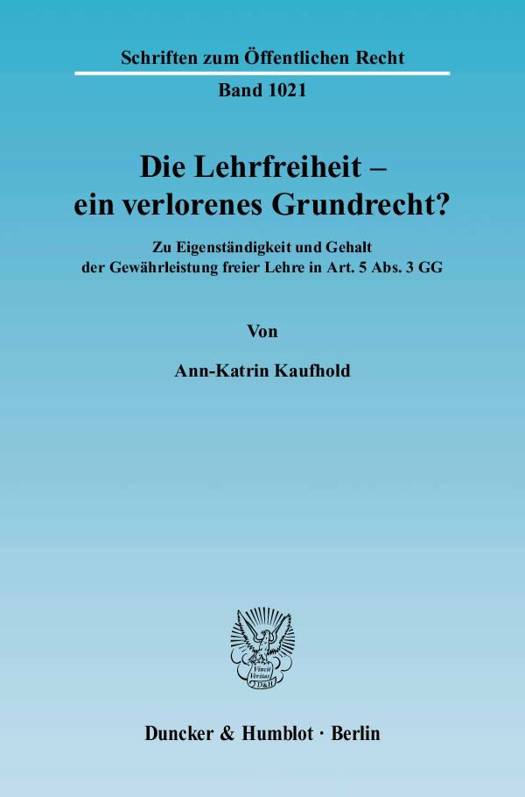 Nach wie vor beschäftigen sich Rechtsprechung und Literatur intensiv mit der in Art. 5 Abs. 3 GG garantierten Freiheit von Wissenschaft, Forschung und Lehre. Gleichwohl haben sie die Lehrfreiheit weitgehend aus dem Blick verloren. Das Schattendasein der Garantie freier Lehre kontrastiert dabei mit grundlegenden Strukturveränderungen ihres Normbereichs, auf die Stichworte wie Lehrevaluation, leistungsorientierte Bezahlung und Bologna-Prozess verweisen. Warum das rechtswissenschaftliche Interesse für die Freiheit der Lehre verloren ging und ob die heute vielfach ausschließliche Konzentration auf Wissenschafts- und Forschungsfreiheit berechtigt ist, sind die zentralen Fragen der Untersuchung. Sie wird angeleitet durch die Hypothesen der Funktions-, Wert- und Konfliktlosigkeit der Lehrfreiheit.Die herrschende Annahme, bei der Wissenschaftsfreiheit handle es sich um ein einheitliches, Lehr- und Forschungsfreiheit umfassendes Grundrecht, könnte an der Erforderlichkeit einer Auseinandersetzung speziell mit der Garantie freier Lehre zweifeln lassen. Eine normbereichsorientierte Konkretisierung von Art. 5 Abs. 3 GG erweist die Lehrfreiheit demgegenüber als eigenständiges Grundrecht, das selbständig neben der Forschungsfreiheit steht und einer eigenen dogmatischen Sprache bedarf. Von einem "Grundrecht der Wissenschaftsfreiheit" sollte nicht mehr gesprochen werden.Zu den wesentlichen dogmatischen Bausteinen der eigenständigen Lehrfreiheit zählt zum einen die Unabhängigkeit der Grundrechtsträgerschaft von einer persönlichen oder institutionellen Verbindung zur Forschung. Von zentraler Bedeutung ist ferner die Wirkung der Lehrfreiheit als Sachbereichsgarantie, die Konsequenz ihrer gewandelten "telæ" und ihres daraus folgenden fremdnützigen Charakters ist. Sie eröffnet eine neue verfassungsrechtliche Perspektive auf die aktuellen Veränderungen in der Hochschullehre. Im Ergebnis zeigt sich die Lehrfreiheit als gewandeltes, nicht verlorenes Grundrecht, das eine selbständige Funktion übernimmt und heute insbesondere für die Lernenden und die Gesellschaft wertvoll ist.