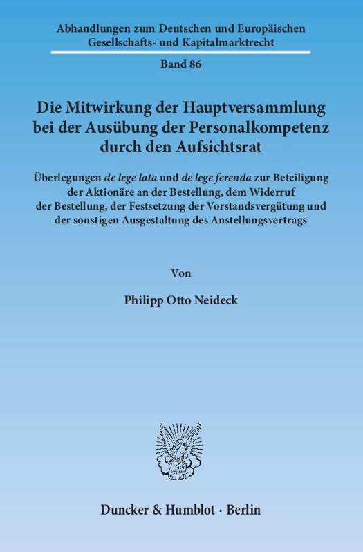 Die Personalkompetenz in Bezug auf den Vorstand wird in der Aktiengesellschaft vom Aufsichtsrat wahrgenommen. Die Aktionäre haben nur sehr begrenzte Mitwirkungsmöglichkeiten. Diese Arbeitsteilung ist im Prinzip seit Einführung des Aktiengesetzes von 1937 in Deutschland unverändert. Soweit Reformen diskutiert und tatsächlich umgesetzt wurden, beschränken sich diese häufig auf den öffentlichkeitswirksamen Bereich der Vorstandsvergütung. Der Autor untersucht, wo die Schwächen des aktuellen Systems liegen und diskutiert unterschiedliche Regulierungsansätze. Dabei wird insbesondere behandelt, welche dogmatischen, ökonomischen und institutionellen Gründe für und gegen eine stärkere Einbeziehung der Hauptversammlung in Personalfragen sprechen. Aus den daraus gewonnenen Ergebnissen werden sodann Rückschlüsse für die einzelnen Aspekte der Personalkompetenz gezogen, wobei der Autor insbesondere Änderungen bei der Festsetzung der Vergütungspolitik und beim Widerruf der Bestellung nach 84 Abs. 3 AktG befürwortet.