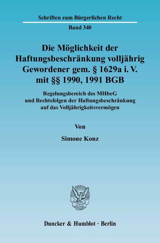 1990, 1991 BGB für volljährig Gewordene die Möglichkeit geschaffen, ihre Haftung auf das Volljährigkeitsvermögen zu beschränken und in 723 I 3 Nr. 2 BGB ein Sonderkündigungsrecht für volljährig gewordene Gesellschafter begründet. Das MHbeG wirft zahlreiche Probleme aus den verschiedensten Bereichen des materiellen Zivil- und Prozeßrechts wie dem Minderjährigen- und Familienrecht, dem Schuldrecht, dem Handels- und Gesellschaftsrecht und nicht zuletzt dem Recht der Erbenhaftung und dem Vollstreckungsrecht auf, die z. T. noch kaum oder gar nicht behandelt wurden. Auf der Höhe der aktuellen Diskussion in Rechtsprechung und Schrifttum entwickelt Simone Konz unter Einbeziehung der wichtigsten seit Inkrafttreten des BGB vertretenen Positionen eigenständige praxisgerechte Lösungen.Die Autorin setzt sich umfassend mit dem Regelungsbereich des MHbeG und unter Darstellung der erbrechtlichen Rechtslage den materiellen und prozessualen Rechtsfolgen der Haftungsbeschränkung, insbesondere dem Rechtsverhältnis zwischen volljährig Gewordenen und Altgläubigern, aber auch etwaigen Auswirkungen der Haftungsbeschränkung auf die Zugriffsmöglichkeiten der Neugläubiger auseinander. Hierbei zeigt sie auf, daß die Interessenlage im Fall der Haftungsbeschränkung des volljährig Gewordenen mit der im Erbrecht in vielen Punkten nicht vergleichbar ist. Die Tatsache, daß der volljährig Gewordene im Gegensatz zum Erben kein fremdes Vermögen übernimmt, hat nicht nur auf die Rechtsstellung des volljährig Gewordenen selbst, sondern auch auf die Schutzwürdig- und -bedürftigkeit der Alt- und Neugläubiger Auswirkungen. Aus dem Erbrecht z. T. bekannte Probleme erscheinen hier in anderem Licht und werden eigenständigen, vielfach neuen Lösungen zugeführt. Abgerundet wird die Darstellung durch eine Erörterung des Spannungsverhältnisses des 1629a BGB zum handelsrechtlichen Verkehrsschutz sowie etwaigen Auswirkungen des MHbeG auf den Minderjährigenschutz und dessen Einfügung in das Haftungssystem.Ausgezeichnet mit dem Förderpreis 2006 für den wissenschaftlichen Nachwuchs des "Freundeskreises der Trierer Universität e. V."