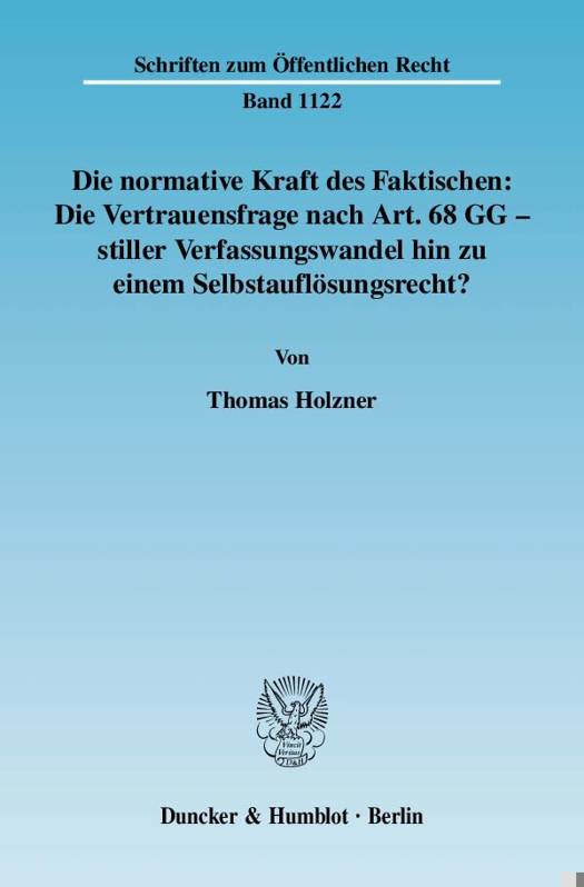 Der Autor, der den interdisziplinären Brückenschlag zwischen zeitgeschichtlichen, politikwissenschaftlichen und staatsrechtlichen Aspekten versucht, kommt zu dem Ergebnis, dass Art. 68 GG durch die Staatspraxis sowie die hiervon getriebene Rechtsprechung des BVerfG einem Verfassungswandel unterlag, der, von der ursprünglichen Zielsetzung des Art. 68 GG abweichend, nun eine Auflösungsmöglichkeit des Bundeskanzlers im Zusammenwirken mit der Mehrheit des Bundestags beinhaltet. Die Aussage Jellineks von der "Normativität des Faktischen" wird dadurch bestätigt und kann somit auch heute noch Aktualität und Geltung beanspruchen.