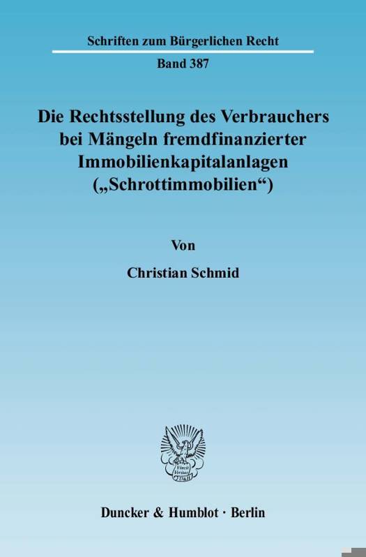 Die Problematik der "Schrottimmobilien" beschäftigt in den letzten Jahren zunehmend Rechtsprechung und Wissenschaft. Es handelt sich hierbei um Immobilieninvestitionen, die professionelle Vermittler unter falschen Versprechungen und gleichzeitigem Abschluss eines Kreditvertrages an wirtschaftlich unbedarfte Verbraucher verkaufen. Scheitert - wie meist - das Projekt später, so stellt sich die Frage, ob, wie und von wem der Verbraucher verlangen kann, die durch arglistige Täuschung entstandenen Schäden ersetzt zu bekommen und ob der ausgereichte Kredit an die Bank zurückgezahlt werden muss.Christian Schmid analysiert die aus den Täuschungen resultierenden Rechte des Verbrauchers gegenüber den Vermittlern, den Initiatoren der Projekte und den beteiligten Banken. Die umfangreiche Rechtsprechung und Literatur wird gründlich untersucht und eingehender Kritik unterzogen. Der Autor befürwortet im Ergebnis eine umfassendere Verantwortlichkeit der Banken.
