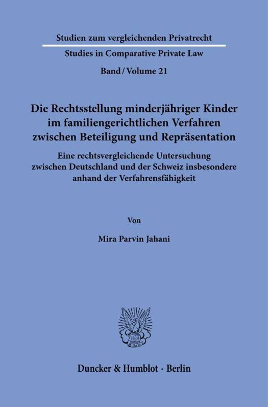 English summary: The Legal Status of Minor Children in Family Court Proceedings between Participation and Representation. A Comparative Legal Study between German and Swiss Law, Particulary Concerning Process Ability Focusing on 9 FamFG, the legal position of minors in family court proceedings in German law is examined. The author argues, based on a comparison with Swiss law, for a change in the law that breaks away from age limits and focuses on individual abilities. The dissertation shows which regulatory options are already available under German law. Findings from the perspectives of developmental psychology and sociology are presented and suggestions for further research are made. German description: Die Arbeit beschaftigt sich mit der Rechtsstellung Minderjahriger im familiengerichtlichen Verfahren. Im Fokus steht 9 FamFG. Die Autorin pladiert fur eine Gesetzesanderung, die sich von starren Altersgrenzen lost und auf die individuellen Fahigkeiten abstellt. Der Vorschlag lehnt sich an Erkenntnisse aus einem Vergleich zum schweizerischen Recht an.Die Untersuchung wirft einen umfassenden Blick auf die Beteiligung Minderjahriger und die Reprasentation ihrer Interessen im familiengerichtlichen Verfahren und analysiert die bestehenden Rechtsgarantien darauf aus verfassungs- und konventionsrechtlichen Quellen. In einem Binnenrechtsvergleich wird aufgezeigt, welche Regelungsmoglichkeiten zur Beteiligung Minderjahriger das deutsche Recht in wichtigen Verfahrensordnungen und im materiellen Recht kennt. Ein letzter Abschnitt prasentiert Erkenntnisse aus entwicklungspsychologischer und soziologischer Sicht und gibt Anstosse, wo in Bezug auf familienrechtliche Verfahren noch Untersuchungsbedarf besteht.