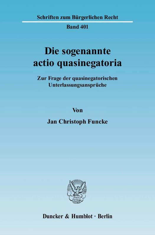 Bereits kurz nach Inkrafttreten des Bürgerlichen Gesetzbuchs ließ das Reichsgericht über die gesetzlich geregelten Fälle hinaus Unterlassungsklagen zum Schutz vor Verletzungen aller deliktisch geschützten Rechtsgüter zu. Dabei stützte es sich vor allem auf eine Analogie zur 'actio negatoria' des 1004 BGB, die dem Institut der quasinegatorischen Unterlassungsklage seinen Namen gab.Die Rechtsprechung hat in der Folge quasinegatorische Unterlassungsklagen in einer Vielzahl von Fallgestaltungen zugelassen. Diese reichen von der Klage auf Unterlassung von Beeinträchtigungen der in 823 Abs. 1 BGB genannten Rechtsgüter über die Klage auf Unterlassung des Verstoßes gegen - im Wege des 823 Abs. 2 BGB ins Zivilrecht inkorporierte - straf- und öffentlich-rechtliche Verbotsnormen bis hin zur vom Bundesgerichtshof jüngst gewährten Klage auf Einhaltung baubehördlicher Auflagen.Die vom Reichsgericht für den quasinegatorischen Rechtsschutz entwickelten Grundsätze werden in der heutigen Rechtsprechung als auch Literatur zumeist keiner Überprüfung unterzogen, sondern als feststehende Rechtssätze behandelt. Indes sind sie geprägt von den am Ende des 19. und zu Beginn des 20. Jahrhunderts vorherrschenden rechtstheoretischen und rechtsdogmatischen Lehren. Jan Christoph Funcke unterzieht daher die bis heute angewendeten Grundsätze des quasinegatorischen Rechtsschutzes einschließlich ihrer rechtshistorischen und rechtstheoretischen Grundlagen einer kritischen Überprüfung.