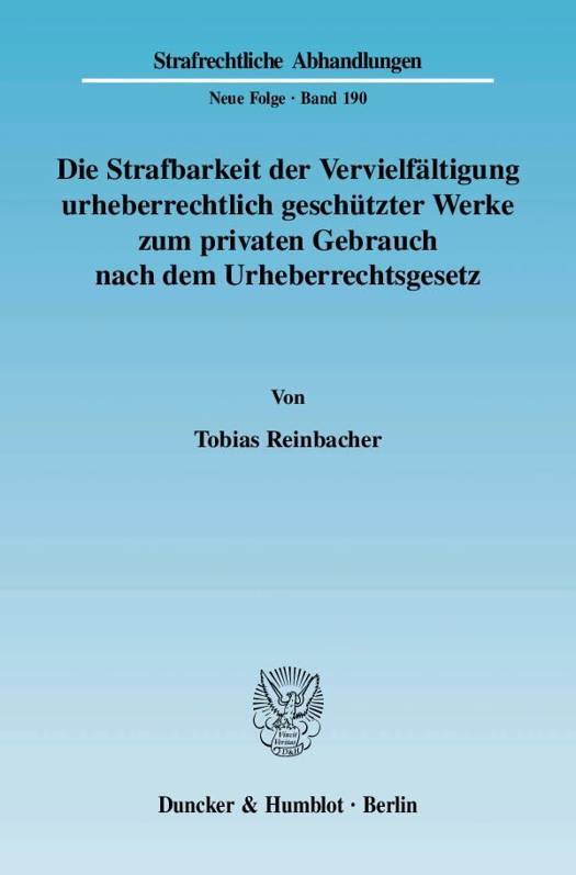Die Strafbarkeit privater Vervielfältigungen urheberrechtlich geschützter Werke per CD-Brenner oder Download aus dem Internet ist wie kaum ein anderes juristisches Thema Gegenstand einer breiten öffentlichen Diskussion. Eine umfassende wissenschaftliche Abhandlung steht indes noch aus, Beiträge aus der Fachliteratur beschränken sich bislang auf das Zivilrecht. Tobias Reinbacher schließt diese Lücke mit dem vorliegenden Werk.