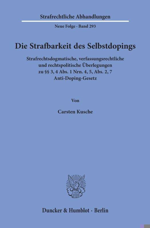 Die Arbeit unterzieht die 2015 vollzogene Neuausrichtung der staatlichen Dopingbekampfung auf den dopenden Sportler einer eingehenden Analyse. Erstmals herausgearbeitet wird dabei u.a., dass die Einnahmeklausel des 4 Abs. 7 Nr. 2 AntiDopG als Auffangklausel fur Mangel im Kontrollsystem des Spitzensports dient und dass die Verfassungskonformitat der Testpool-Klausel des 4 Abs. 7 Nr. 2 davon abhangt, dass man sie mit der hier vertretenen Auffassung als normatives und nicht etwa als Blanketttatbestandsmerkmal einstuft. Auaerdem verzahnt die Arbeit die strafrechtsdogmatische Rechtsgutsdiskussion mit der verfassungsrechtlichen Verhaltnismaaigkeitsprufung und bezieht dabei auch die Bedeutung der Abgrenzung des Rechtsguts vom Schutzreflex ein. Sie kommt insoweit zu dem Schluss, dass die Selbstdopingdelikte verfassungskonform sind. Aus einem rechtspolitischen Blickwinkel betrachtet erscheint deren Schaffung indes eher als staatliche Symbolpolitik denn als ernsthaftes Bekenntnis gegen Doping im Spitzensport.