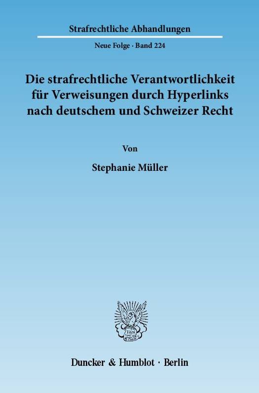 Stephanie Müller stellt das Querschnittsthema der strafrechtlichen Verantwortlichkeit für das Setzen und Vorhalten von Hyperlinks systematisch dar und leuchtet die einzelnen Aspekte der Materie aus. Es werden neben den zu diesem Thema bekannten Schweizer und deutschen Strafverfahren auch bisher nicht publizierte Entscheide u. a. aus dem Nebenstrafrecht vorgestellt und bewertet. Als Ergebnis der intensiven Auseinandersetzung mit den komplexen technischen Fragen, welche ebenfalls erläutert werden, stellt Stephanie Müller einen Regelungsvorschlag der strafrechtlichen Linkproviderverantwortlichkeit für das Schweizer und deutsche StGB vor.