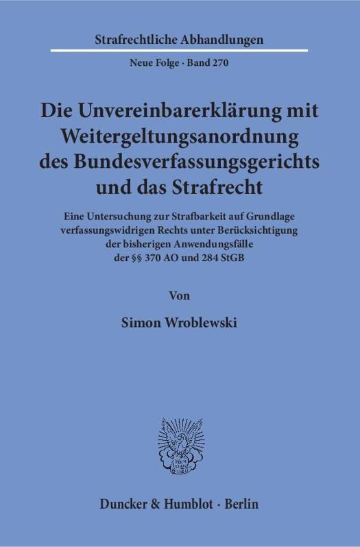 Die Unvereinbarerklärung mit Weitergeltungsanordnung ist eine besondere Entscheidungsvariante des Bundesverfassungsgerichts. Bei dieser wird ein Gesetz zwar für verfassungswidrig, allerdings während einer Übergangszeit für weiterhin anwendbar erklärt. Im Zusammenhang mit Straftatbeständen, die auf außerstrafrechtliche Normen Bezug nehmen (bspw. Blanketttatbestände), kann dies dazu führen, dass auf Grundlage einer bereits für verfassungswidrig befundenen außerstrafrechtlichen Norm die Strafbarkeit in Frage steht. Praktisch relevant wurde dieses Problem bislang im Steuer- und Glücksspielstrafrecht. Der Autor untersucht, ob in einer solchen Konstellation eine Strafbarkeit gegeben ist. Dazu erörtert er zunächst umfangreich die umstrittenen verfassungsprozessrechtlichen Grundlagen der Unvereinbarerklärung und der Weitergeltungsanordnung sowie deren Voraussetzungen. Nach einer Auseinandersetzung mit den relevanten Entscheidungen des Bundesverfassungsgerichts und der einschlägigen strafrechtlichen Rechtsprechung und Literatur leitet er aus den verfassungsprozessrechtlichen Grundlagen die Voraussetzungen der Strafbarkeit her.