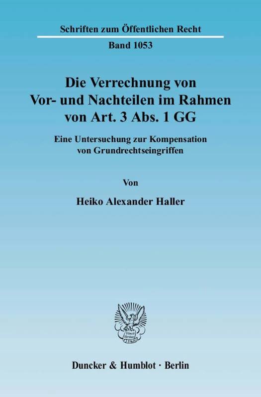 Bei der Erörterung des Art. 3 I GG blieb bislang stets die Frage ausgespart, ob eine benachteiligende Ungleichbehandlung auch dann noch vorliegt, wenn diese in einer Gesamtbetrachtung durch Vorteile aufgewogen wird. Der Autor entwickelt das für diese Fragestellung fehlende dogmatische Fundament. Hierzu wird zunächst nachgewiesen, daß diese Kompensation eine eigenständige Rechtsfigur darstellt, die sich nicht im Verhältnismäßigkeitsgrundsatz verorten läßt. Der Verfasser zeigt, daß die Verhältnismäßigkeitsprüfung einen Rechtsgüterkonflikt voraussetzt, die Kompensation diesen jedoch gerade beseitigt.