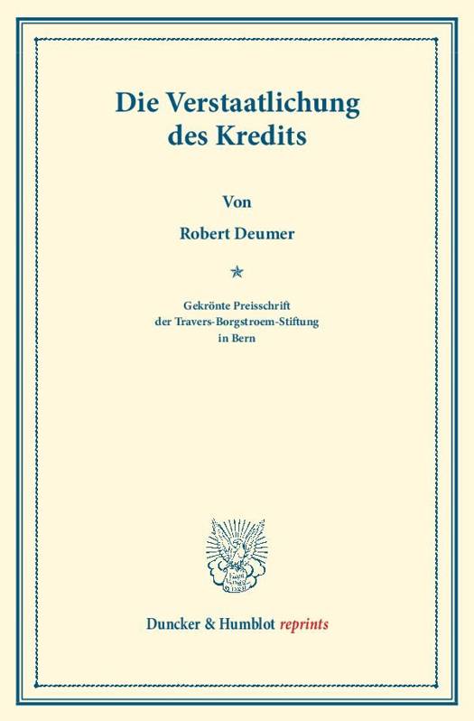 Das vorliegende Werk ist der Beitrag Robert Deumers zu dem von der Travers-Borgstroem-Stiftung ausgeschriebenen Preisausschreiben zum Thema "Verstaatlichung des Kredits" und wurde mit dem ersten Preis ausgezeichnet. Deumer zeichnet darin die Entwicklung des Banken- und Kreditwesens nach und untersucht, unter welchen Voraussetzungen eine Verstaatlichung Sinn ergibt. Viele seiner Gedanken haben nichts an Aktualität eingebüßt: So heißt es im Vorwort: "Wenn man in Betracht zieht, welche wirtschaftliche Macht die Banken in sich vereinen, daß sie diese Macht im hohen Maße den deponierten Geldern des Publikums verdanken, und daß das Publikum in der Sicherheit seines Vermögens durch eine gewagte Geschäftsführung seitens der Banken erheblich gefährdet werden kann, so wird man sehr wohl begreifen, daß schon aus diesem Grunde der Staat sich eingehender mit der Tätigkeit der Banken zu befassen wünscht." (S. 8)