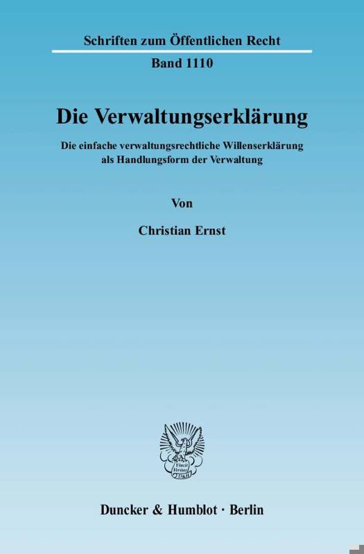 So wie die Willenserklärung das zentrale Element des Zivilrechts ist, dominiert der Verwaltungsakt das Verwaltungsrecht. Gleichwohl finden sich immer wieder Hinweise auf eine Willenserklärung im Verwaltungsrecht. Worum es sich dabei handelt, war bislang jedoch ungeklärt. Christian Ernst etabliert die verwaltungsrechtliche Willenserklärung als abstrakte und eigenständige Handlungsform der Verwaltung in einer Breite, wie bislang nur Verwaltungsakt oder öffentlich-rechtlicher Vertrag durchdrungen waren. Dazu werden nicht nur umfassend ihre Erscheinungsformen zusammengestellt, ihre dogmatischen Grundlagen und ein zugrunde liegender Wille der Verwaltung hergeleitet, sondern insbesondere die Anforderungen an ihre Rechtmäßigkeit erschöpfend abstrakt dargelegt, wie z. B. Rechtsgrundlagen, Ermessens- und Zweckmäßigkeitsgrenzen, eine Irrtums- und Fehlerfolgenlehre oder formelle und materielle Aspekte wie Zuständigkeiten, Auslegung, Bekanntgabe, Aufhebung oder Nebenbestimmungen.