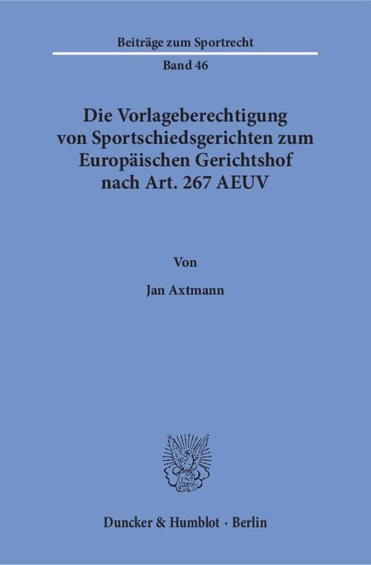 Die Arbeit begründet die Vorlageberechtigung von Sportschiedsgerichten zum EuGH in drei einander teilweise ergänzenden Ansätzen. Neben einer umfassenden Auslegung des Art. 267 AEUV ist Ausgangspunkt der Untersuchung die Rechtsprechung des Europäischen Gerichtshofs. Die vom EuGH aufgestellten Kriterien zur Vorlageberechtigung werden dabei zunächst auf Sportschiedsgerichte angewendet. Für deren Erfüllung werden unter anderem die Wirksamkeit von Schiedsvereinbarungen im Sport sowie die Eigenheiten des Sports - auch unter Beachtung der lex sportiva - ausführlich untersucht. Zuletzt erfolgt eine dogmatische Begründung der aufgestellten Kriterien anhand der bei der Auslegung gefundenen Ergebnisse unter Rückgriff auf das europäische Rechtsstaatsprinzip. Dies erlaubt die Einordnung der Kriterien in ein bewegliches System nach der Idee Walter Wilburgs. Daneben wird auch eine Vorlagepflicht für letztinstanzliche Sportschiedsgerichte begründet, eine Vorlage durch den Court of Arbitration for Sport (CAS) hingegen abgelehnt.