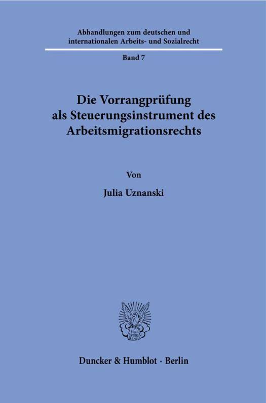 Seit über 50 Jahren dient die Vorrangprüfung als zentrales Steuerungsinstrument des deutschen Arbeitsmigrationsrechts: An der Schnittstelle zwischen Arbeits- und Zuwanderungsrecht wird mit ihr geprüft, ob für eine Beschäftigung, für die ein drittstaatsangehöriger Ausländer ein Arbeitsplatzangebot in Deutschland erhalten hat, »bevorrechtigte« Arbeitnehmer (also Deutsche, ihnen hinsichtlich des Arbeitsmarktzugangs gleichgestellte Drittstaatsangehörige und EU-Bürger) nicht zur Verfügung stehen ( 39 Abs. 3 Nr. 3 AufenthG). Im Lichte des in den vergangenen Jahren graduell reduzierten Anwendungsbereichs der Vorrangprüfung hinterfragt diese Arbeit kritisch, inwiefern die Vorrangprüfung überhaupt noch einen Platz im modernen Arbeitsmigrationsrecht hat, und betrachtet im Zuge dessen die Stellung der Vorrangprüfung in der Systematik des Arbeitsmigrationsrechts sowie ihren Begriff, ihre Voraussetzungen, ihren Anwendungsbereich und Aufstieg und Fall, ihren Sinn und Zweck sowie mögliche Alternativen.