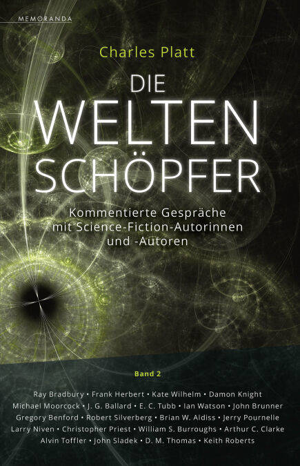 Der zweite Band der drei Bände umfassenden Reihe präsentiert zwanzig der fast sechzig Essays, die auf Charles Platts Gesprächen mit bedeutenden SF-Persönlichkeiten basieren. Die Texte entstanden zwischen 1978 und 1982 und werden nun erstmals vollständig auf Deutsch vorgelegt. In zahlreichen zusätzlichen Texten und Ergänzungen, die Charles Platt jetzt, vier Jahrzehnte später, exklusiv für diese deutsche Ausgabe verfasst hat, erzählt er weitere Anekdoten und persönliche Erinnerungen an seine Gesprächspartner. In Band 2: Gespräche mit Ray Bradbury, Frank Herbert, Kate Wilhelm & Damon Knight, Michael Moorcock, J. G. Ballard, E. C. Tubb, Ian Watson, John Brunner, Gregory Benford, Robert Silverberg, Brian W. Aldiss, Jerry Pournelle, Larry Niven, Christopher Priest, William S. Burroughs, Arthur C. Clarke, Alvin Toffler, John T. Sladek, D. M. Thomas und Keith Roberts.