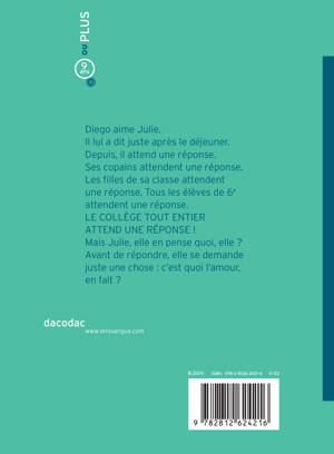 Diego aime Julie. Il lui a dit juste après le petit déjeuner. Depuis, il attend une réponse. Ses copains attendent une réponse. Les filles de sa classe attendent une réponse. Tous les élèves de 6e attendent la réponse. LE COLLÈGE TOUT ENTIER ATTEND SA RÉPONSE ! Mais Julie, elle en pense quoi ? Ben Julie, elle se demande juste une chose avant de répondre : c'est quoi l'amour, en fait ?