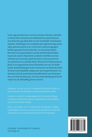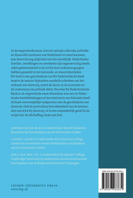 In de negentiende eeuw, toen de centrale culturele, politieke en financiële instituten van Nederland tot stand kwamen, was slavernij nog altijd deel van het wereldrijk. Nederlandse families, instellingen en overheden zijn tegenwoordig steeds vaker geïnteresseerd in de rol die hun rechtsvoorgangers hebben gespeeld in het koloniale en slavernijverleden. Dit boek is een geschiedenis van De Nederlandsche Bank waarin de auteurs bijzondere aandacht schenken aan het verband met slavernij, zowel als factor in de economie en als onderwerp van politiek debat. Doordat De Nederlandsche Bank in de negentiende eeuw dienstbaar was aan de Nederlandse handelsbelangen en het ministerie van Koloniën heeft de bank onvermijdelijk raakpunten met de geschiedenis van slavernij. Ook de particuliere betrokkenheid van de bestuurders van DNB bij slavernij, of in een uitzonderlijk geval bij de strijd voor de afschaffing, komt aan bod.