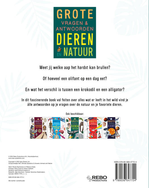 Weet jij welke aap het hardst kan brullen? Of hoeveel een olifant op een dag eet? En wat het verschil is tussen een krokodil en een alligator? In dit fascinerende boek vol feiten over alles wat er leeft in het wild vind je álle antwoorden op je vragen over de natuur en je favoriete dieren.