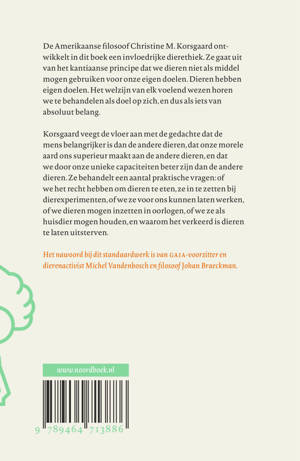 De Amerikaanse filosoof Christine M. Korsgaard ontwikkelt in dit boek een invloedrijke dierethiek. Ze gaat uit van het kantiaanse principe dat we dieren niet als middel mogen gebruiken voor onze eigen doelen. Dieren hebben eigen doelen. Het welzijn van elk voelend wezen horen we te behandelen als doel op zich, en dus als iets van absoluut belang.