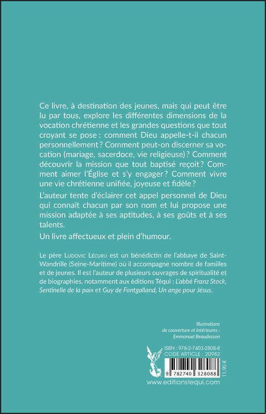 Dans ce livre à destination des adolescents de 11 à 16 ans, mais qui peut être lu par tous, le père Ludovic Lécuru explore à travers plusieurs grandes figures bibliques les différentes dimensions de la vocation chrétienne : - Comment Dieu appelle chacun personnellement, - Comment discerner sa propre vocation (mariage, sacerdoce, vie religieuse), - Comment comprendre la mission que tout baptisé reçoit, - Comment aimer l'Église et s’y engager, - Comment vivre une vie chrétienne unifiée, joyeuse et fidèle. L'auteur qui a accompagné de nombreux jeunes au cours de son ministère tente d'éclairer cet appel personnel de Dieu qui connaît chacun par son nom et lui propose une mission adaptée à ses aptitudes et à ses talents. Un livre affectueux et plein d'humour.
