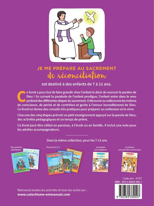 Un beau livret pour se préparer au sacrement de la réconciliation, avant de faire sa première communion et pour toute sa vie. Ce parcours a pour objectif de faire grandir le désir des enfants de recevoir le pardon de Dieu et de les introduire aux notions de conscience, péché et de contrition, tout en leur donnant des conseils très pratiques pour les guider. Chaque étape prévoit : un temps d’enseignement, richement illustré, qui s’appuie sur la parole de Dieu, des activités pédagogiques et des fiches pratiques, un temps de prière.