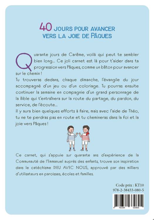 Chaque jour, ce carnet offre un extrait de la parole de Dieu, des prières et de petites actions pour progresser concrètement sur le chemin du Carême. Le Mercredi des Cendres, les dimanches et les jours de la Semaine Sainte sont plus développés avec les lectures complètes du jour ainsi que des activités ludiques. Quarante jours de Carême pour se préparer à Pâques et s’approcher de Dieu pas à pas.