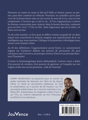 Personne ne remet en cause le fait qu’il faille se former, passer un permis, pour bien conduire un véhicule. Pourtant on considère qu’on peut vivre de la bonne façon sans ne rien savoir du sens de la vie, sans ne rien comprendre à l’univers qui a créé la vie… si l’on n’apprend pas à activer les bonnes commandes pour avancer dans la bonne direction, comment peut-on bien vivre ? C’est un fait : dans l’ignorance qui est la nôtre on fonce vers un mur. Vu de cette manière, ce livre peut se définir comme un guide de vie dans lequel sont caractérisés la mission assignée aux représentants de la vie intelligente que nous sommes ; l’éthique et les pouvoirs à développer pour mener cette mission à bien. Au fil des définitions, l’argumentation prend forme. Le raisonnement logique sur l’existence déploie son pouvoir de persuasion. De quoi convaincre que l’univers a un principe créateur (Dieu) et un principe directeur (l’harmonie). Comme la fantasmagorique pierre philosophale, l’univers nous a doté d’un pouvoir de création, d’un pouvoir de guérison et l’enquête sur son origine révèle une sacrée promesse : celle de l’éternité.