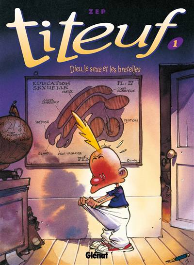 Titeuf n’est pas le caïd de la cour de récré, mais il est le «sale gosse» préféré des lecteurs et, il y a 17 ans, comme un OVNI dans le paysage éditorial de l’époque, sortait le premier album de Titeuf. 11 albums plus tard, Zep a entraîné des millions de lecteurs du monde entier et créé un phénomène unique. Dieu, le sexe et les bretelles était paru en noir et blanc : Zep a décidé d’y revenir, pour lui donner un net coup de jeune, et confie pour cela la colorisation à Nob.