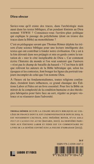 Saviez-vous qu’il existe des traces, dans l’archéologie mais aussi dans les textes bibliques, d’un pendant féminin au Dieu nommé YHWH ? Connaissez-vous l’arrière-plan politique qui explique le passage du polythéisme (dont on trouve des traces dans la Bible) au monothéisme ? C’est en pédagogue savant que Thomas Römer déploie les trésors d’une science biblique pour une lecture intelligente des textes qui ont contribué à fonder notre civilisation. On y est à la fois dérouté dans nos préjugés et mis en garde contre la tentation de « nier le côté inexplicable de Dieu ». À l’heure où les fondamentalismes, toutes religions confondues, étendent leurs influences, ce grand classique des Éditions Labor et Fides est un livre essentiel. Pour lire la Bible en miroir de la complexité de la condition humaine et des théologies fabriquées pour faire face au sort, réguler sa propre violence et se réassurer dans l’adversité.