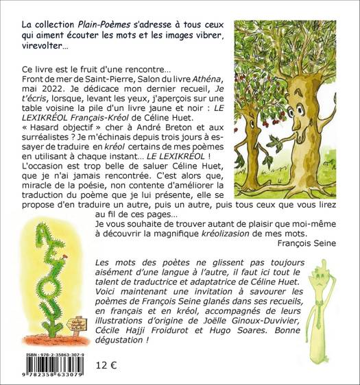 La collection Plain-Poèmes s’adresse à tous ceux qui aiment écouter les mots et les images vibrer, virevolter… - Ce livre est le fruit d'une rencontre… Front de mer de Saint-Pierre, La Réunion, Salon du livre Athéna, mai 2022. Je dédicace mon dernier recueil, "Je t'écris", lorsque, levant les yeux, j'aperçois sur une table voisine la pile d'un livre jaune et noir : le "Lexikréol Français-Kréol" de Céline Huet. "Hasard objectif" cher à André Breton et aux surréalistes ? Je m'échinais depuis trois jours à essayer de traduire en kréol certains de mes poèmes en utilisant à chaque instant… le "Lexikréol" ! L'occasion est trop belle de saluer Céline Huet, que je n'ai jamais rencontrée. C'est alors que, miracle de la poésie, non contente d'améliorer la traduction du poème que je lui présente, elle se propose d'en traduire un autre, puis un autre, puis tous ceux que vous lirez au fil de ces pages… Je vous souhaite de trouver autant de plaisir que moi-même à découvrir la magnifique kréolizasion de mes mots. François Seine - Les mots des poètes ne glissent pas toujours aisément d’une langue à l’autre, il faut ici tout le talent de traductrice et adaptatrice de Céline Huet. Voici maintenant une invitation à savourer les poèmes de François Seine glanés dans ses recueils,en français et en kréol, accompagnés de leurs illustrations d’origine de Joëlle Ginoux-Duvivier, Cécile Hajji Froidurot et Hugo Soares. Bonne dégustation !