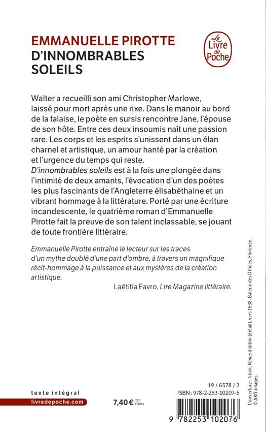 D’innombrables soleils est à la fois une plongée dans l’intimité de deux amants, l’évocation d’un des poètes les plus fascinants de l’Angleterre élisabéthaine et un vibrant hommage à la littérature. Porté par une écriture incandescente, le quatrième roman d’Emmanuelle Pirotte fait la preuve de son talent inclassable, se jouant de toute frontière littéraire.