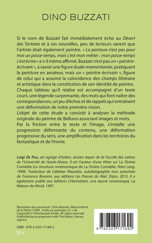 Si le nom de Buzzati fait immédiatement écho au Désert des Tartares et à ses nouvelles, peu de lecteurs savent que l’artiste était également peintre. « La peinture n’est pas pour moi un passe-temps, mais c’est mon métier ; mon passe-temps c’est écrire » a-t-il même affirmé. Buzzati n’est pas un « peintre-écrivant », à savoir une figure duale momentanée, pratiquant la peinture en amateur, mais un « peintre-écrivain », figure de celui qui a assumé la coïncidence des champs littéraire et artistique dans la constitution de son identité de peintre. Chaque tableau qu’il réalise est accompagné d’un texte court, une légende surprenante, des mots qui font naître des correspondances, un jeu d’échos et de rappels qui entraînent une déformation de notre première vision. L’objet de cette étude a consisté à analyser la méthode originale du peintre de Belluno associant images et mots.