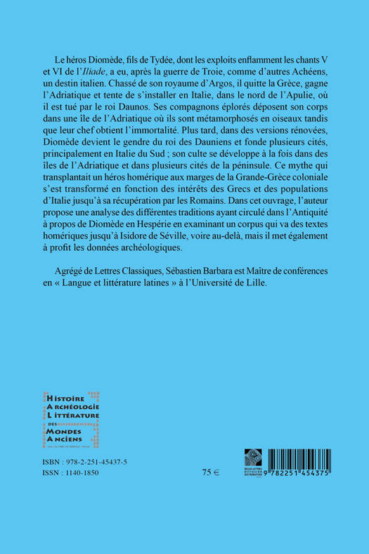 Le héros Diomède, fils de Tydée, dont les exploits enflamment les chants V et VI de l’Iliade, a eu, après la guerre de Troie, comme d’autres Achéens, un destin italien. Chassé de son royaume d’Argos, il quitte la Grèce, gagne l’Adriatique et tente de s’installer en Italie, dans le nord de l’Apulie, où il est tué par le roi Daunos. Ses compagnons éplorés déposent son corps dans une île de l’Adriatique où ils sont métamorphosés en oiseaux tandis que leur chef obtient l’immortalité. Plus tard, dans des versions rénovées, Diomède devient le gendre du roi des Dauniens et fonde plusieurs cités, principalement en Italie du Sud ; son culte se développe à la fois dans des îles de l’Adriatique et dans plusieurs cités de la péninsule. Ce mythe qui transplantait un héros homérique aux marges de la Grande-Grèce coloniale s’est transformé en fonction des intérêts des Grecs et des populations d’Italie jusqu’à sa récupération par les Romains. Dans cet ouvrage, l’auteur propose une analyse des différentes traditions ayant circulé dans l’Antiquité à propos de Diomède en Hespérie en examinant un corpus qui va des textes homériques jusqu’à Isidore de Séville, voire au-delà, mais il met également à profit les données archéologiques.
