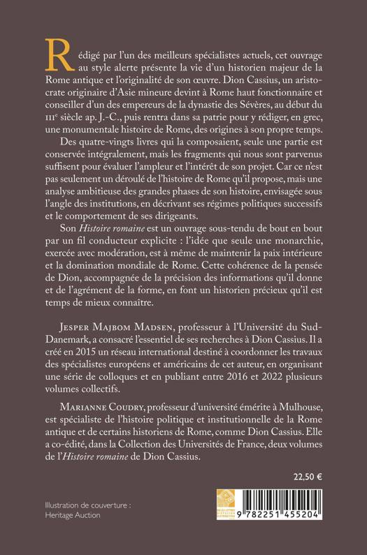 Redige par l'un des meilleurs specialistes actuels, cet ouvrage au style alerte presente la vie d'un historien majeur de la Rome antique et l'originalite de son oeuvre. Dion Cassius, un aristocrate originaire d'Asie mineure devint a Rome haut fonctionnaire et conseiller d'un des empereurs de la dynastie des Severes, au debut du IIIe siecle ap. J.-C., puis rentra dans sa patrie pour y rediger, en grec, une monumentale histoire de Rome, des origines a son propre temps. Des quatre-vingts livres qui la composaient, seule une partie est conservee integralement, mais les fragments qui nous sont parvenus suffisent pour evaluer l'ampleur et l'interet de son projet. Car ce n'est pas seulement un deroule de l'histoire de Rome qu'il propose, mais une analyse ambitieuse des grandes phases de son histoire, envisagee sous l'angle des institutions, en decrivant ses regimes politiques successifs et le comportement de ses dirigeants. Son Histoire romaine est un ouvrage sous-tendu de bout en bout par un fil conducteur explicite: l'idee que seule une monarchie, exercee avec moderation, est a meme de maintenir la paix interieure et la domination mondiale de Rome. Cette coherence de la pensee de Dion, accompagnee de la precision des informations qu'il donne et de l'agrement de la forme, en font un historien precieux qu'il est temps de mieux connaitre.