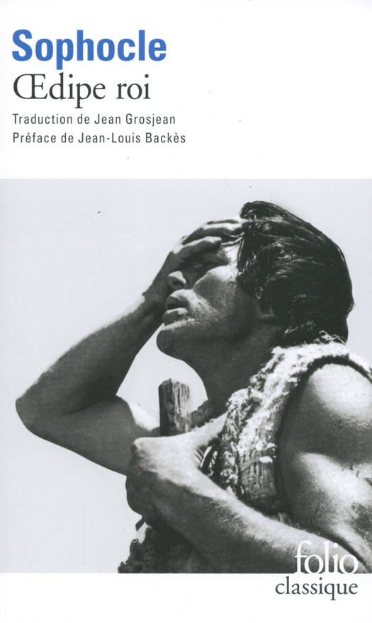 La ville de Thèbes est ravagée par la peste. Son souverain, Œdipe, mène l'enquête. Il découvre que l'homme qu'il a tué jadis, Laïos, était son père, et qu'il a épousé sa propre mère, Jocaste, dont il a eu quatre enfants. Elle se suicide, il se crève les yeux et s'exile. Une des plus belles tragédies de l'Histoire, modèle de l'enquête policière et de son suspens, de la peinture de la destruction de soi, et des relations troubles qui tissent les liens familiaux, grande interrogation jetée au destin, cette pièce est à l'origine de nombreuses imitations (jusqu'à Gide et Cocteau) et de nombreux commentaires (jusqu'à Freud ou Jean-Pierre Vernant). "Ô lumière c'est la dernière fois que je te vois, je suis né de qui je ne devais pas, je suis uni à qui je ne dois pas, j'ai tué qui je n'aurais pas dû." Œdipe roi, IIIᵉ épisode.