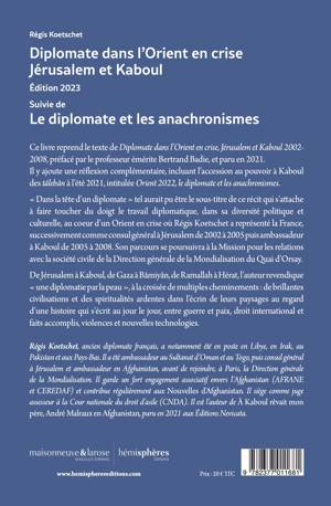« Dans la tête d’un diplomate » tel aurait pu être le sous-titre de ce récit qui s’attache à faire toucher du doigt le travail diplomatique, dans sa diversité politique et culturelle, au coeur d’un Orient en crise où Régis Koetschet a représenté la France, successivement comme consul général à Jérusalem de 2002 à 2005 puis ambassadeur à Kaboul de 2005 à 2008. Son parcours se poursuivra à la Mission pour les relations avec la société civile de la Direction générale de la Mondialisation du Quai d’Orsay. De Jérusalem à Kaboul, de Gaza à Bâmiyân, de Ramallah à Hérat, l’auteur revendique « une diplomatie par la peau », à la croisée de multiples cheminements : de brillantes civilisations et des spiritualités ardentes dans l’écrin de leurs paysages au regard d’une histoire qui s’écrit au jour le jour, entre guerre et paix, droit international et faits accomplis, violences et nouvelles technologies. On trouvera dans cette nouvelle édition une réflexion complémentaire, incluant l’accession au pouvoir à Kaboul des talibans à l’été 2021.
