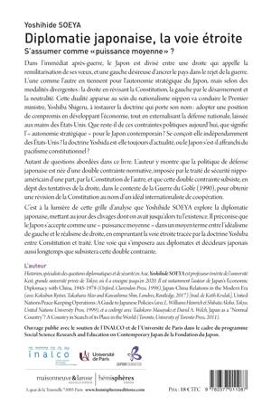 Dans l’immédiat après-guerre, le Japon, divisé entre une droite qui appelle la remilitarisation de ses vÅux et une gauche désireuse d’ancrer le pays dans le rejet de la guerre, adopte la «Â doctrine Yoshida »Â : une position de compromis développant l’économie tout en externalisant la défense nationale, laissée aux mains des États-Unis. Soeya Yoshihide montre que la politique de défense japonaise, née d’une double contrainte normative imposée par le traité de sécurité nippo-américain d’une part, par la Constitution de l’autre, subsiste. Il préconise que le Japon s’accepte comme une «Â puissance moyenne » semblable à la France ou au Royaume-Uni, dans un moyen terme entre l’idéalisme de gauche et le réalisme de droite, en empruntant la voie étroite tracée par la doctrine Yoshida entre Constitution et traité. Une voie qui s’imposera aux diplomates et décideurs japonais comme la seule possible, aussi longtemps que subsistera cette double contrainte.