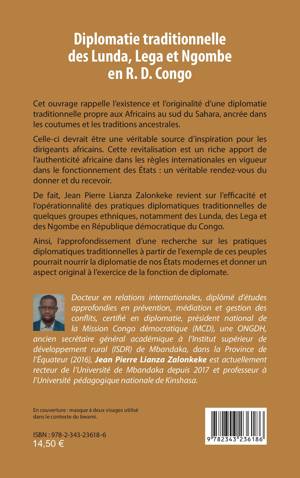 Cet ouvrage rappelle l'existence et l'originalité d'une diplomatie traditionnelle propre aux Africains au sud du Sahara, ancrée dans les coutumes et les traditions ancestrales. Jean Pierre Lianza Zalonkeke revient sur l'efficacité et l'opérationnalité des pratiques diplomatiques traditionnelles de quelques groupes ethniques, notamment des Lunda, des Lega et des Ngombe en République démocratique du Congo. Ainsi, l'approfondissement d'une recherche sur les pratiques diplomatiques traditionnelles à partir de l'exemple de ces peuples pourrait nourrir la diplomatie de nos États modernes et donner un aspect original à l'exercice de la fonction de diplomate.