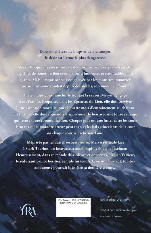 À Sturmfrost, les loups ne pardonnent pas. Meryn Cooper n’a jamais rêvé de devenir une liée, ces guerriers d’élite capables de nouer un lien mental avec d’immenses et redoutables loups géants. Mais lorsque sa sœur est enlevée par les monstres immortels que son royaume combat depuis des siècles, son monde s’effondre. Prête à tout pour franchir le front et la sauver, Meryn s’engage dans l’armée. Propulsée dans les Épreuves du Lien, elle doit survivre à une ascension mortelle, puis à quatre mois d’entraînement au château. Et surtout, elle doit apprendre à apprivoiser le lien avec une louve sauvage qui refuse toute communication. Chaque jour est une lutte, entre les cours brutaux où la moindre erreur peut tuer, et les bals étincelants de la cour où chaque sourire cache une lame. Méprisée par les autres recrues, isolée, Meryn est seule face à Stark Therion, un instructeur aussi impitoyable que fascinant. Heureusement, dans ce monde de violence et de secrets, Killian Valtiere, le séduisant prince héritier, semble lui tendre la main. Pourtant, tomber amoureuse pourrait bien être sa dernière erreur…