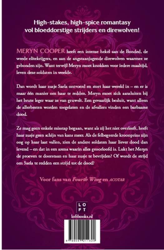 Meryn Cooper heeft een intense hekel aan de Bonded, de wrede elitekrijgers, en aan de angstaanjagende direwolven waarmee ze gebonden zijn. Want terwijl Meryn moet knokken voor iedere maaltijd, leven deze soldaten in weelde. Dan wordt haar zusje Saela ontvoerd en stort haar wereld in – en er is maar één manier om haar te redden. Meryn moet zich aansluiten bij het brute leger waar ze van gruwelt. Een gevaarlijk besluit, want alleen de allerbesten worden toegelaten en de afvallers vinden een barbaarse dood. Ze mag geen enkele misstap begaan, want als zij het niet overleeft, heeft haar zusje geen schijn van kans meer. Als de felbegeerde kroonprins zijn oog op haar laat vallen, zien de andere soldaten haar liever dood dan levend – en dat in een arena waarin alles geoorloofd is. Lukt het Meryn de proeven te doorstaan en haar zusje te bevrijden? Of wordt de strijd om Saela te redden een strijd tot de dood? Inclusief bonushoofdstuk. Voor fans van Fourth Wing en A Court of Thorns and Roses. Perfect voor liefhebbers van: