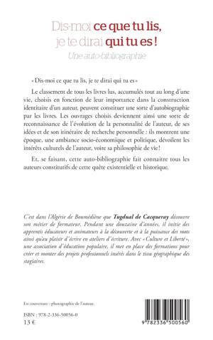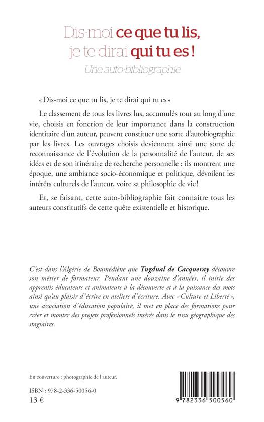 Dis-moi ce que tu lis, je te dirai qui tu es Le classement de tous les livres lus, accumulés tout au long d'une vie, choisis en fonction de leur importance dans la construction identitaire d'un auteur, peuvent constituer une sorte d'autobiographie par les livres. Les ouvrages choisis deviennent ainsi une sorte de reconnaissance de l'évolution de la personnalité de l'auteur, de ses idées et de son itinéraire de recherche personnelle ils montrent une époque, une ambiance socio-économique et politique, dévoilent les intérêts culturels de l'auteur, voire sa philosophie de vie ! Et, se faisant, cette auto-bibliographie fait connaitre tous les auteurs constitutifs de cette quête existentielle et historique.