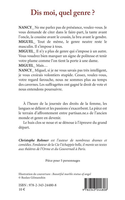 NANCY_ Ne me parlez pas de préséance, voulez-vous. Je vous demande de citer dans le faire-part, la tante avant l'oncle, la cousine avant le cousin, la bru avant le gendre. MIGUEL_ Tout de même, le genre neutre reste le masculin. Il s'impose à tous. MIGUEL_ Il n'y a plus de genre qui s'impose à un autre. Vous voudrez bien marquer un signe de politesse et tenir votre plume comme l'on tient la porte à une dame. MIGUEL_ Mais... NANCY_ Miguel, si je ne vous savais pas très intelligent, je vous croirais volontiers stupide. Cessez, voulez-vous, votre regard farouche, nous ne sommes plus au temps des cavernes. Les suffragettes ont gagné le droit de vote et nous entendons poursuivre. À l'heure de la journée des droits de la femme, les langues se délient et les passions s'exacerbent. La pièce est le terrain d'affrontement entre partisan.ne.s de l'ancien monde et genre en devenir. Le huis clos se noue et se dénoue à l'épreuve du grand départ.